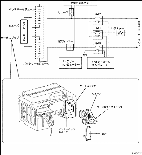 サービスプラグは点検整備時に取り外すことで、HVバッテリの中間位置で高電圧を遮断し、作業安全性を確
